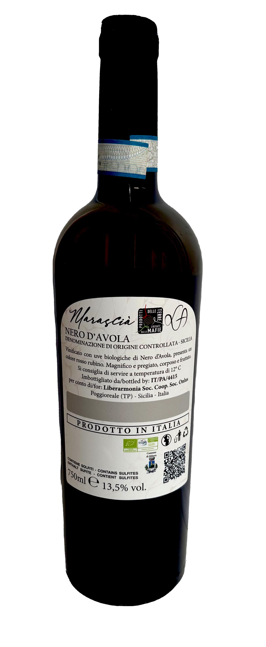 Vino Nero d’Avola DOC Sicilia biologico, proveniente dalle terre liberate dalle mafie e dai produttori associati. Vino rosso ottenuto da uve biologiche della cultivar Nero d’Avola, una varietà autoctona siciliana originaria dell’area sud-orientale dell’isola (zona di Avola, da cui prende il nome), espressione autentica del territorio e della tradizione vitivinicola locale. Di colore rosso rubino intenso, presenta un profumo avvolgente con sentori fruttati e note tipiche del vitigno. Al palato è equilibrato e armonico, con una buona struttura e un finale persistente. Ideale in abbinamento a piatti di carne, formaggi stagionati e preparazioni della cucina mediterranea. Un vino che unisce qualità, identità territoriale e impegno sociale, simbolo di legalità e riscatto.