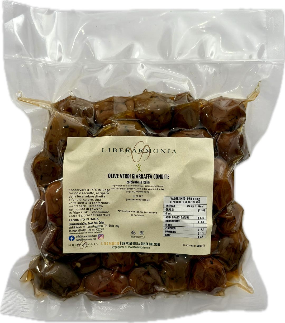 Olive verdi della varietà Giarraffa, cultivar autoctona siciliana, lavorate secondo tradizione e condite con olio extravergine di oliva e aromi naturali, per esaltarne il gusto autentico. Dal sapore equilibrato e delicatamente aromatico, con polpa tenera, sono ideali come antipasto, per aperitivi, per arricchire insalate, piatti freddi e preparazioni della cucina mediterranea. Un prodotto genuino che unisce qualità, tradizione e legame con il territorio, espressione di una lavorazione artigianale attenta e consapevole.