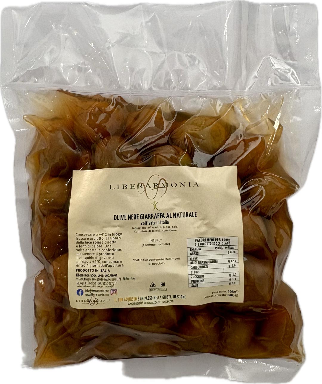 Olive nere della varietà Giarraffa, cultivar autoctona siciliana, tradizionalmente diffusa nelle aree interne dell’isola e apprezzata per la sua polpa tenera e il gusto delicato. Conservate al naturale, mantengono le caratteristiche autentiche del frutto. Dal sapore equilibrato e leggermente aromatico, sono ideali come antipasto, per arricchire insalate, piatti freddi, focacce e preparazioni della cucina mediterranea. Un prodotto genuino che racchiude qualità, tradizione e legame con il territorio, espressione di un’agricoltura attenta e consapevole.